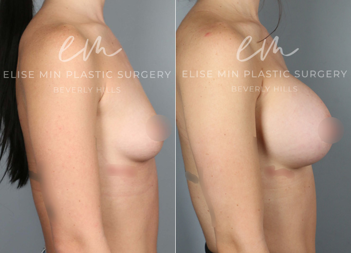 This delightful patient in her 20s was seeking breast augmentation to achieve a more proportionate and balanced figure. She expressed that bras in general did not fit her very well. Upon examination, it was found that she would fit into an estimated A cup-sized bra before the procedure, and she desired to be a C cup size. She also had wide breast dimensions at baseline, so the tailored surgical plan for her unique anatomy was to use low-plus profile breast implants. This allowed her to achieve a result that is natural and proportional as the breast implants filled out her wider chest.