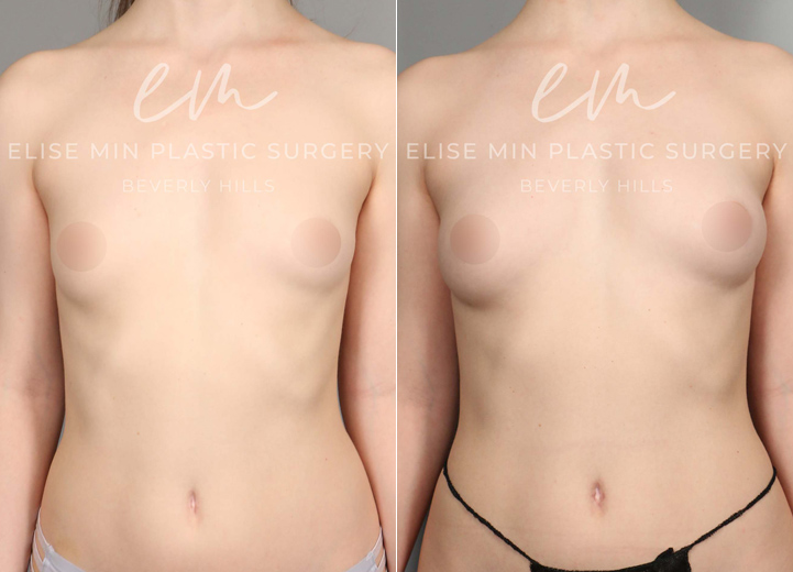 This is a 30 year-old woman who had small B cup-sized breasts. She was mostly content with her breast shape and size but wanted her breasts to fill in her bra a little more. She was hoping for a fuller B cup size. The only issue was she was overall very thin, but that meant I had to go to multiple sites to harvest enough fat to graft. After finding fat cells from her abdomen, flanks, lower back and thighs, I transferred 120cc fat cells to the right breast and 100cc to the left breast. This is her postoperative result after six months from the time of her procedure, and she is looking fabulous and feeling great about how her breasts fit in her bra.